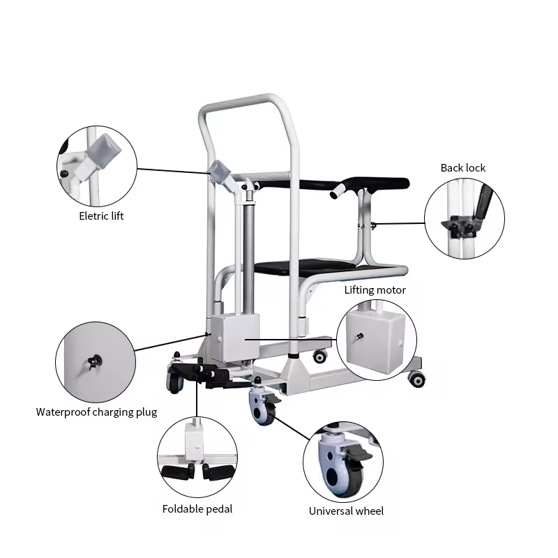 Stolica za prijenos električnog dizala pruža prikladan i siguran način prijenosa pacijenata. Negovatelji mogu lako prebaciti pacijente u krevete, kupaonice, toalete i druge lokacije. Kombinacija crno -bijele je lijepa i elegantna. Glavno tijelo prihvaća čeličnu strukturu visoke čvrstoće, koja je čvrsta i izdržljiva i može sigurno izdržati teret od 135 kilograma. Ne može se koristiti samo kao stolica za dizanje prijenosa, već i kao invalidska kolica, toaletna stolica, tuš stolica. To je prvi izbor za njegovatelje i njihove obitelji.